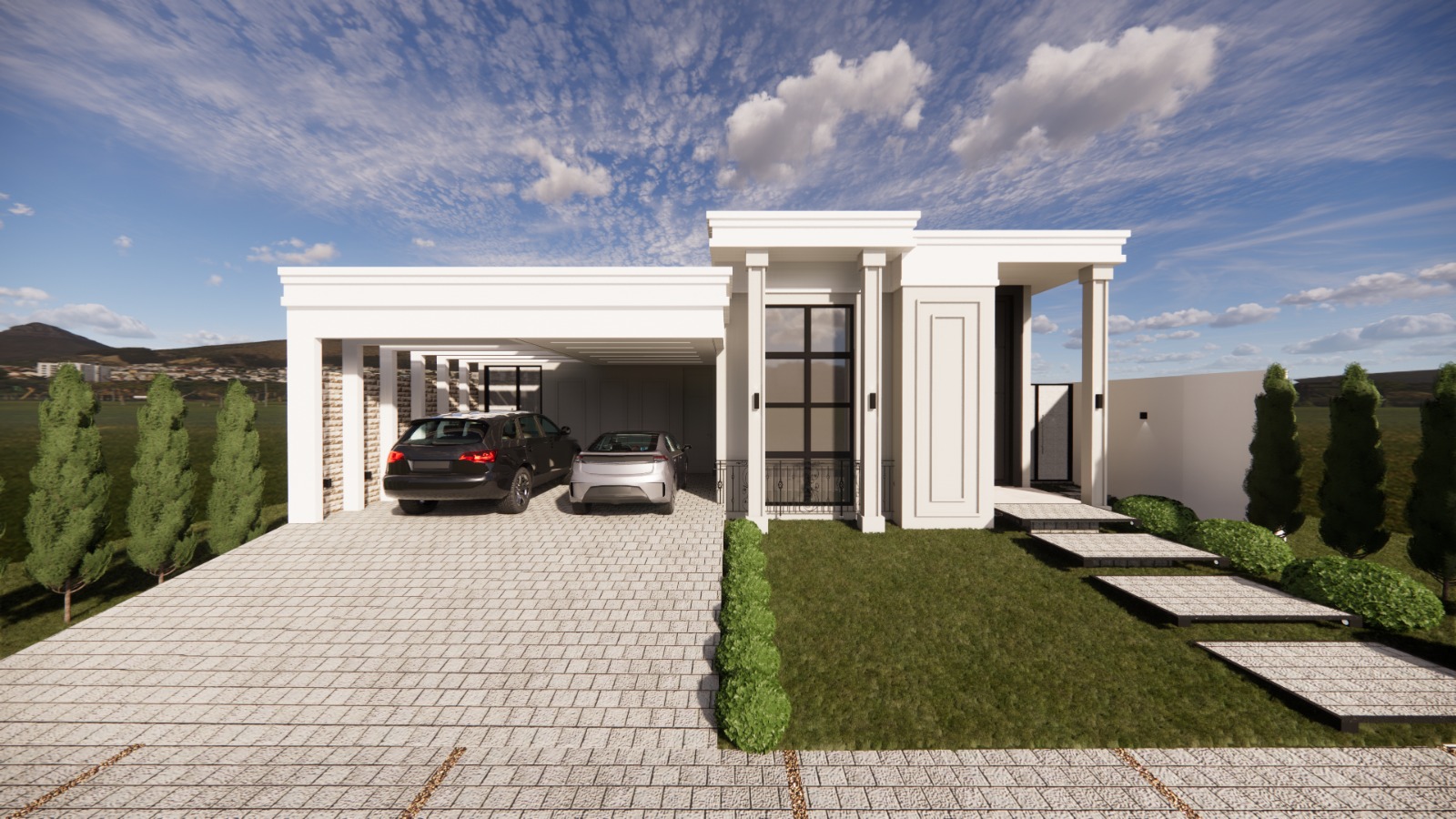Além disso, a área de garagem coberta demonstra uma atenção à funcionalidade sem comprometer o aspecto visual. O espaço foi projetado para acomodar dois veículos com praticidade, mantendo a linearidade e o equilíbrio do design.