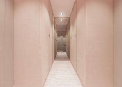 O uso do branco em toda a estrutura realça a imponência e pureza das formas, enquanto os volumes bem definidos e a simetria presente na composição remetem à tradição neoclássica, trazendo uma sensação de ordem e equilíbrio. A entrada principal, destacada pelo uso de grandes portas e janelas verticais, sugere um convite elegante, proporcionando um jogo interessante de luz e sombra que valoriza o espaço interno.